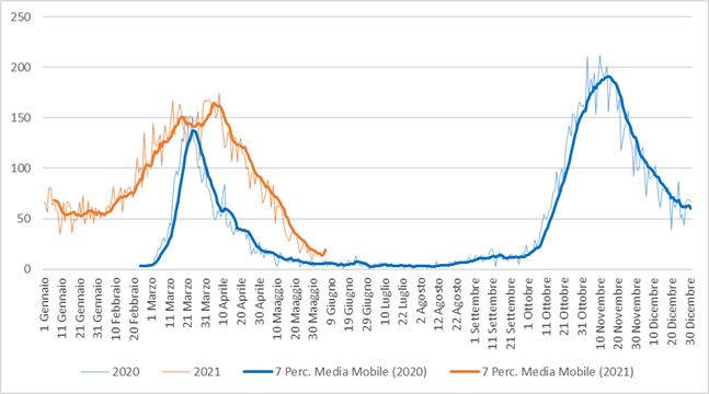 Figura 1. Ricoveri giornalieri (nuove ammissioni) per Covid-19 e media mobili (7 giorni), anno 2020 e periodo gennaio – maggio 2021. Regione Toscana. Fonte flusso SDO.