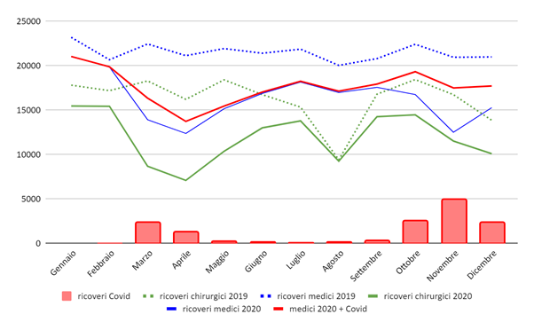 In alcuni casi la riduzione era stata cercata, con la finalità di preservare gli ospedali (strutture, percorsi e personale) disponibili alla risposta all’ondata pandemica, ma in molte patologie l’assistenza ospedaliera non è stata erogata nella quantità voluta, talvolta per mancato allarme da parte dei pazienti (patologie mediche tempo dipendenti), talaltra per la ridotta accessibilità alla diagnostica e alla consultazione specialistica.