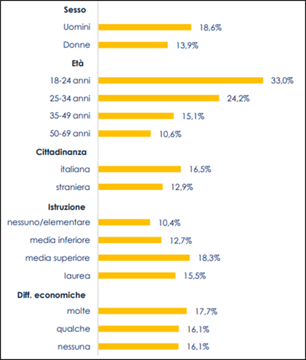 Il consumo a rischio riguarda soprattutto uomini, giovani, con cittadinanza italiana e con un livello di istruzione più alto, mentre non sembra variare in modo significativo in base alle condizioni economiche (Figura 2).