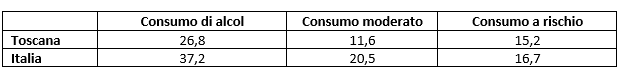 In Toscana, circa un adulto su sei presenta un consumo a maggior rischio, mentre tra gli adolescenti persistono livelli elevati di binge drinking e di ubriacature, seppur in lieve diminuzione nel tempo. Anche nella popolazione anziana si osservano quote non trascurabili di consumo eccedentario, spesso legate a modelli culturali consolidati.