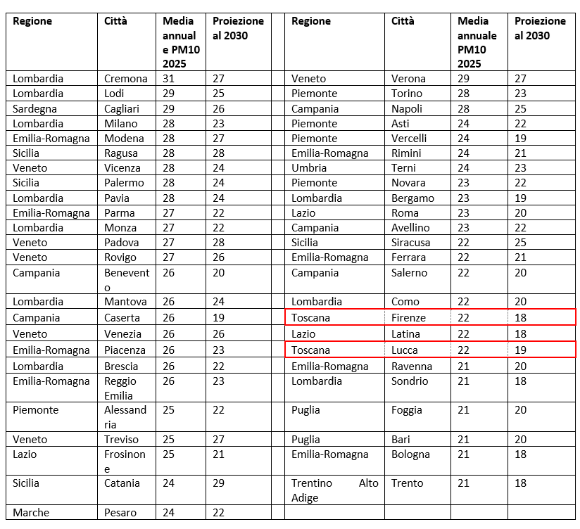 Legambiente, nel suo ultimo report, ha analizzato i dati PM10 degli ultimi quindici anni, stimando la traiettoria della media annuale di PM10 nel prossimo quinquennio. Delle 89 città di cui si dispongono i dati, ben 33 potrebbero non raggiungere l’obiettivo dei 20 microgrammi per metro cubo. Tra le città che potrebbero farcela ci sono Firenze e Lucca, ad oggi sopra la soglia dei 20 microgrammi per metro cubo, ma che in un orizzonte al 2030, potrebbero rientrare tra i 18 e i 20 microgrammi per metro cubo (Tabella1).