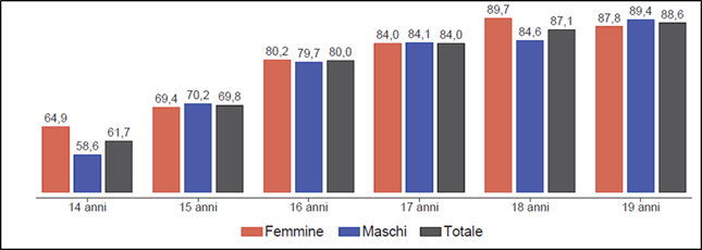 La differenza di genere, evidente tra i più giovani (58,6% dei maschi contro il 64,9% delle femmine a 14 anni), tende a ridursi con l’età e si annulla a partire dai 16 anni. Complessivamente, le femmine (79,3%) mostrano una prevalenza lievemente superiore rispetto ai maschi (77,9%), in controtendenza rispetto alle prime edizioni dell’indagine, dove erano i ragazzi a presentare valori più elevati.